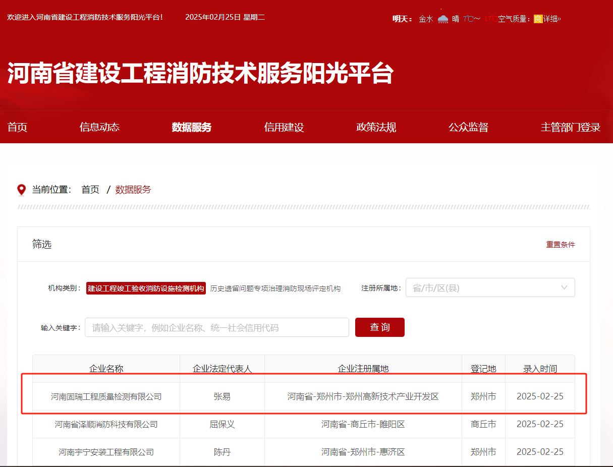 熱烈祝賀河南固瑞工程質(zhì)量檢測有限公司入冊河南省建設工程消防技術服務陽光平臺?。。?